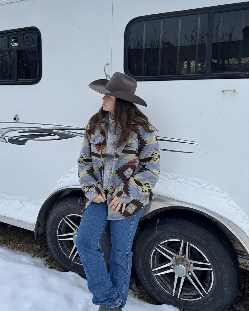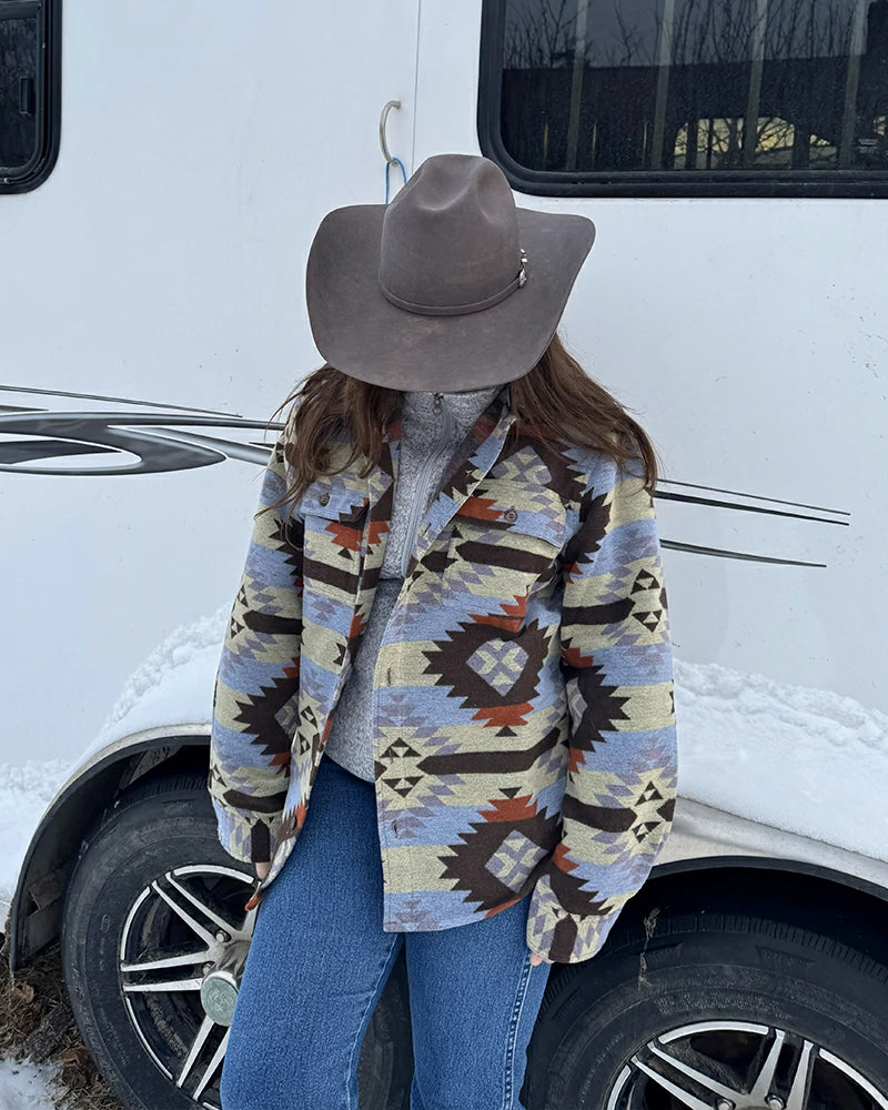 Stay stylish and comfortable with our men's Aztec shirt jacket. Made from wool blend fabric, this shirt features two pockets on the front for easy access and a stylish design perfect for any occasion. It's preshrunk and machine washable, and overlock seams prevent fatigue. Wear it on its own or as a jacket over the crew neck for a versatile look.