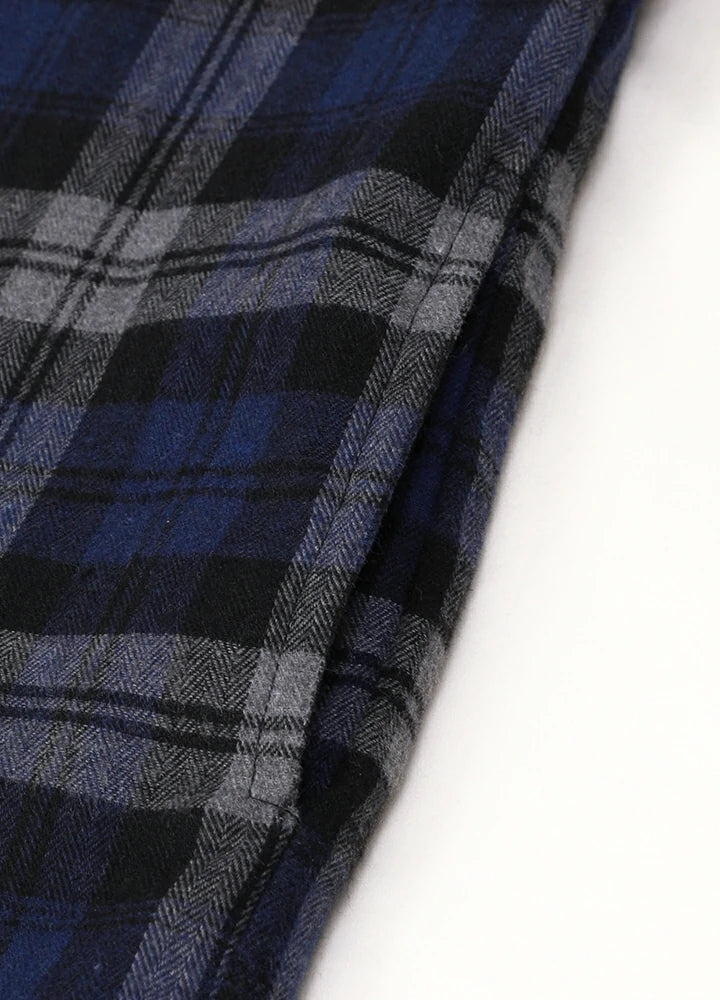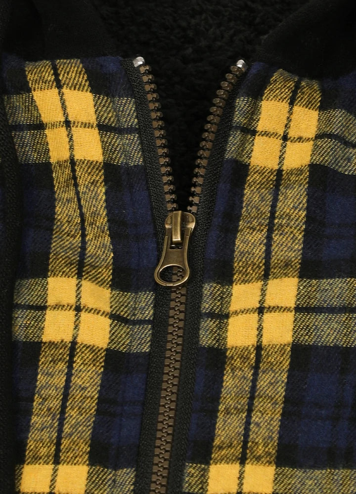 Front view of a man in a navy khaki men's plaid flannel hooded jacket walking in the grass