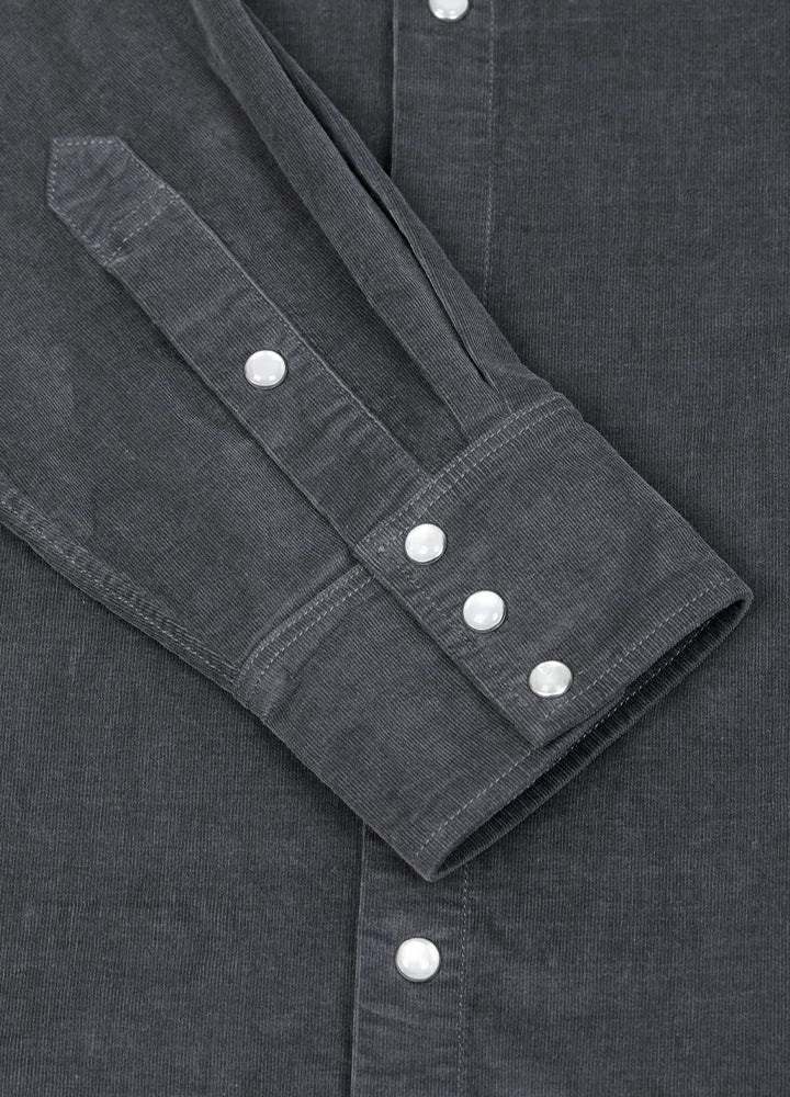 This corduroy shirt follows the design philosophy of "paying tribute to the classic 1950s Western style." It is crafted from a 5.6oz blend of 98% cotton and 2% spandex, regular fit, offering a balanced weight and moderate stretch for comfort. Dual zigzag flap pockets, diagonal slashes on the shoulders to add visual dimension, and a mountain-shaped yoke on the back that enhances structure. The collar is adorned with a black white striped patch for added comfort. A pearl snap button placket, classic Western-style three-snap cuffs, and sword-point cuff vents accented with pearl buttons. Machine washable.