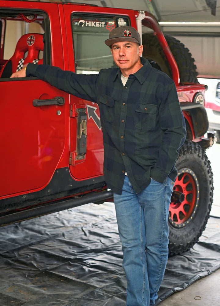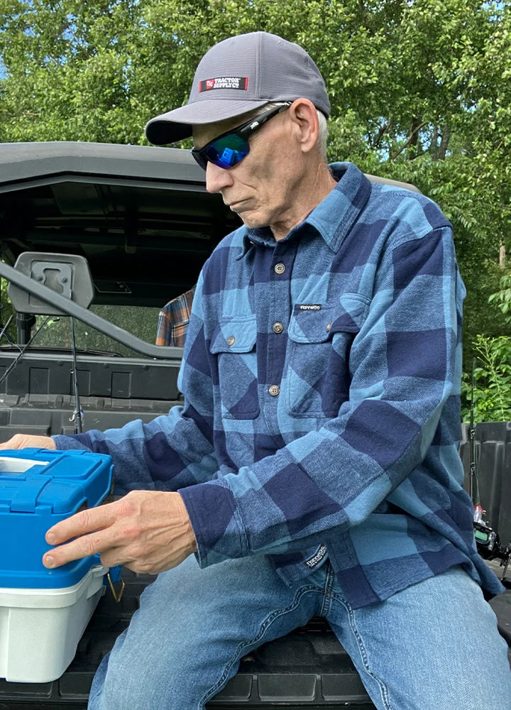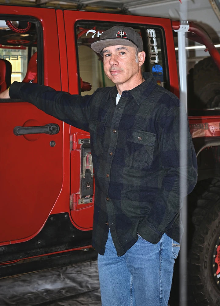 Front view of a man wearing a dark green men's stalwart cotton flannel shirt standing next to his car