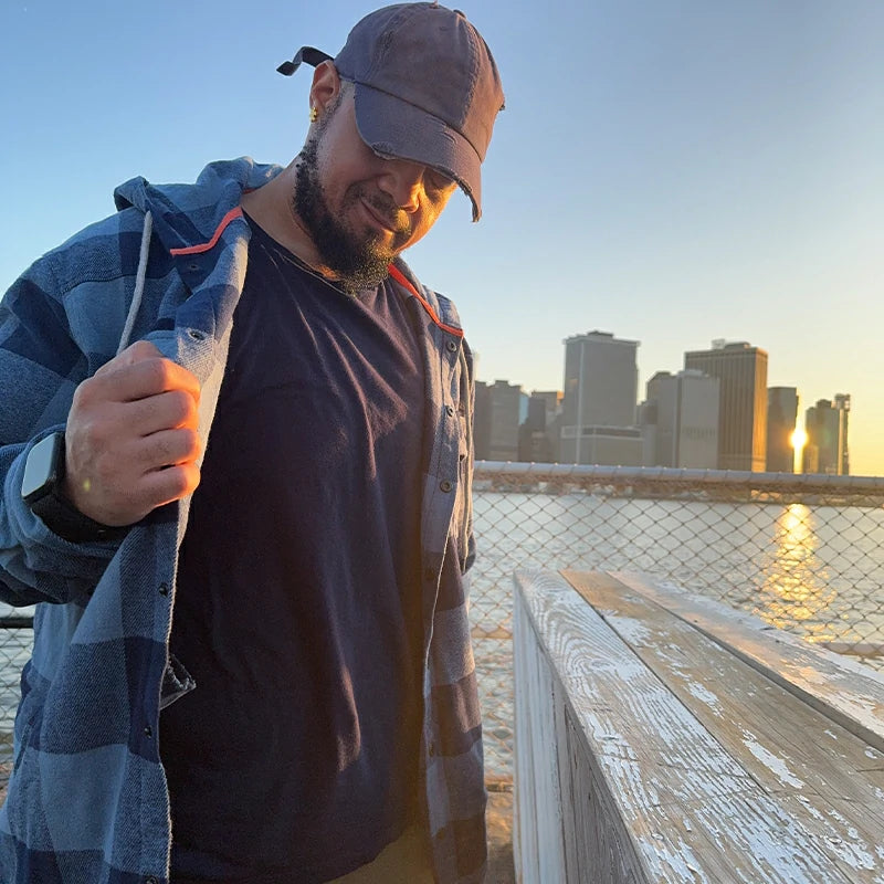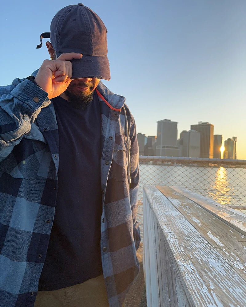 Man in a blue heavyweight flannel hoodie