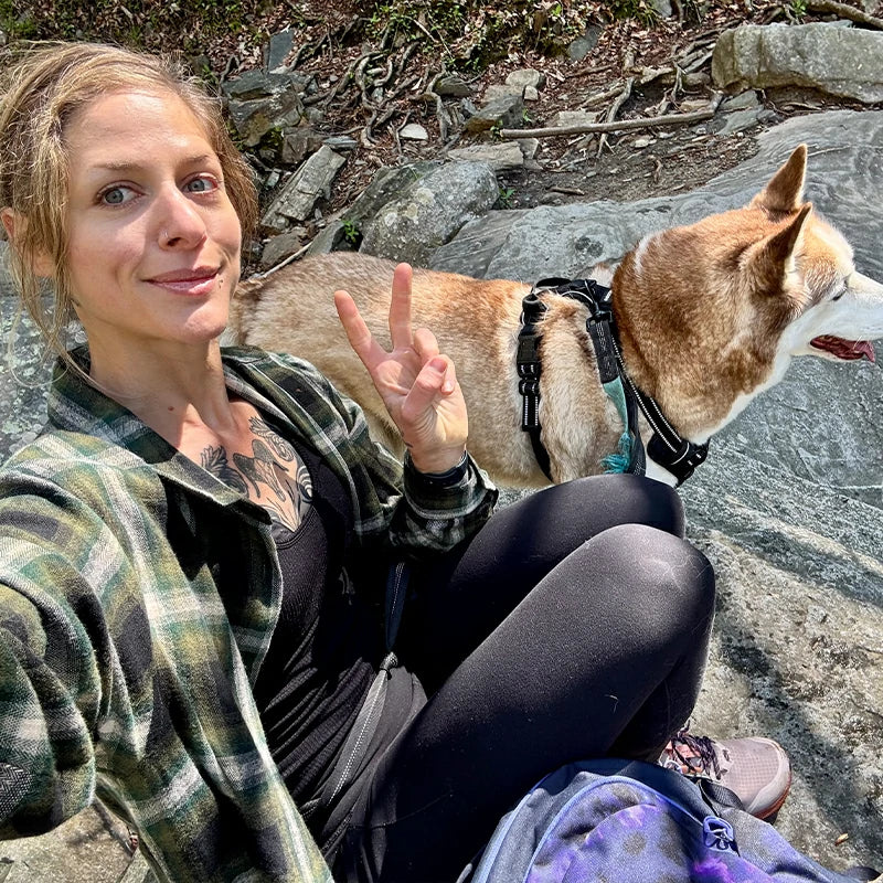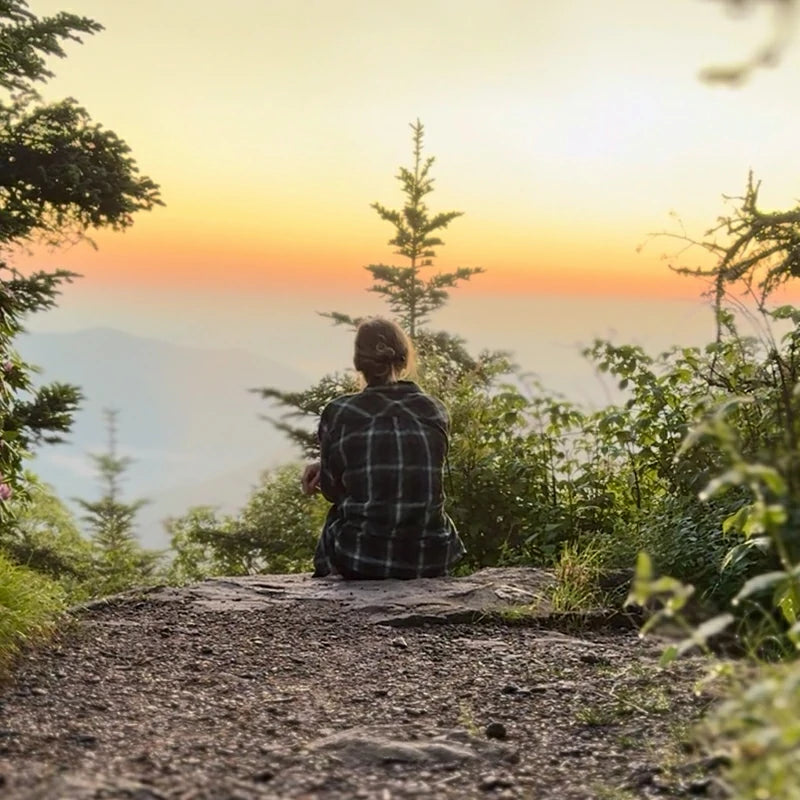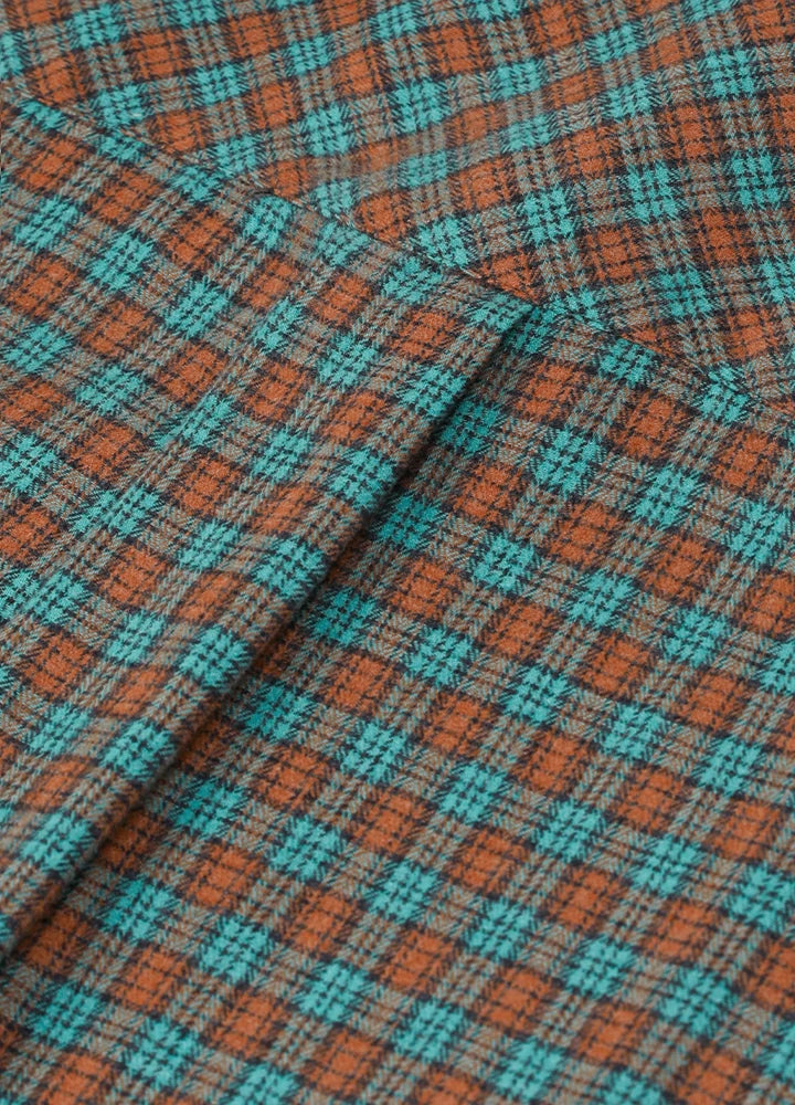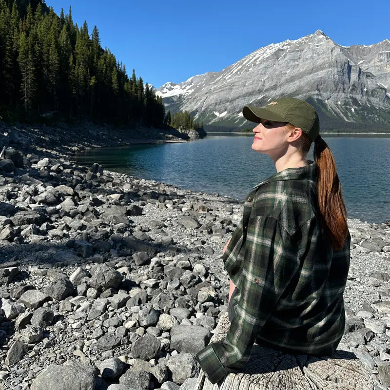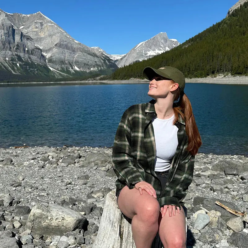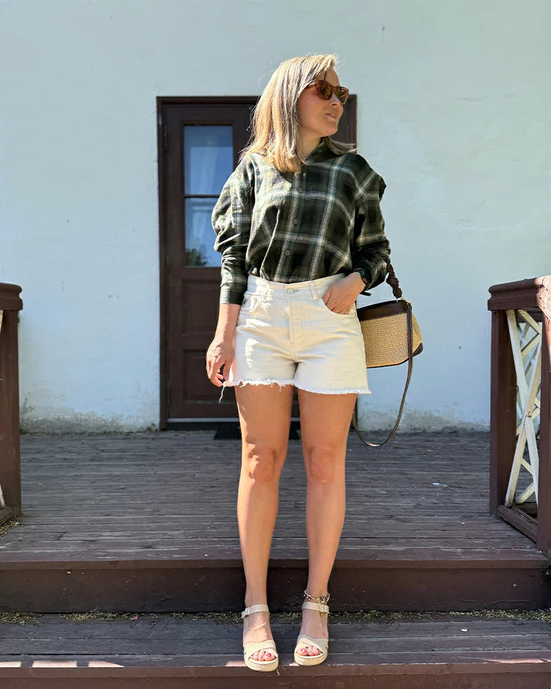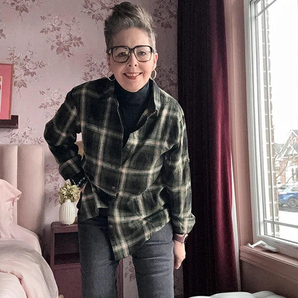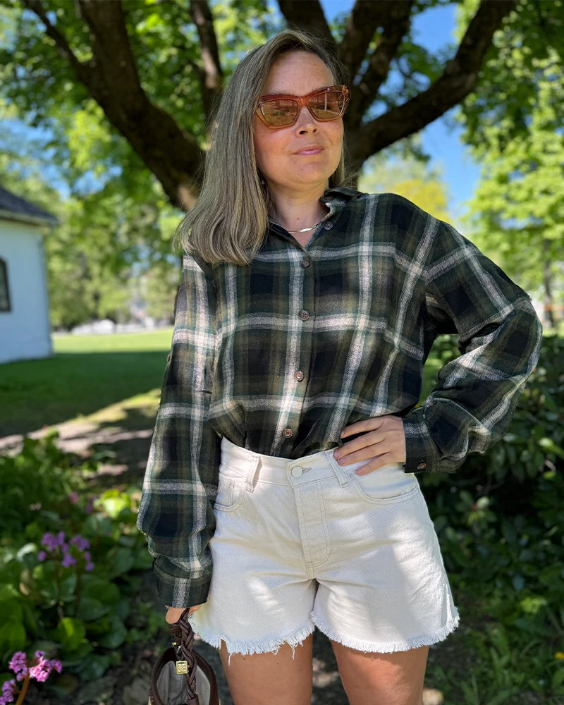 Women in a dark green long sleeves flannel plaid shirt with button down