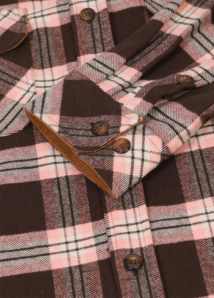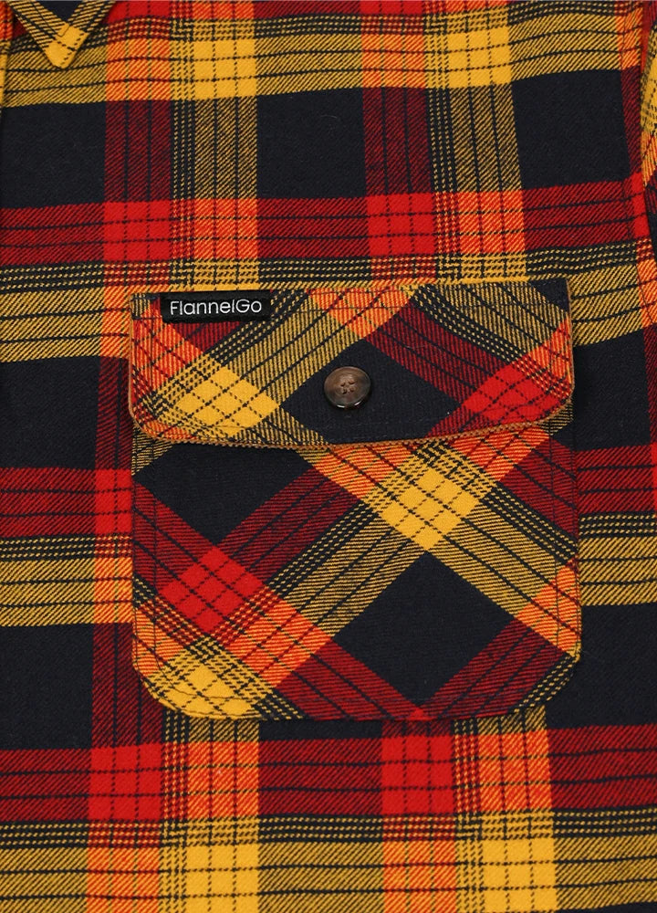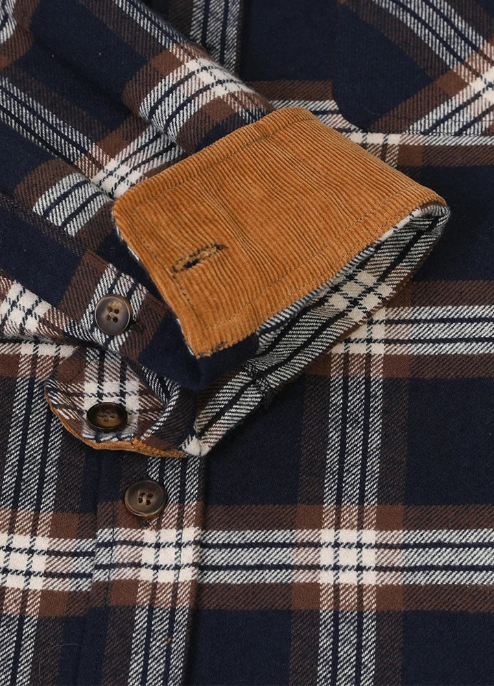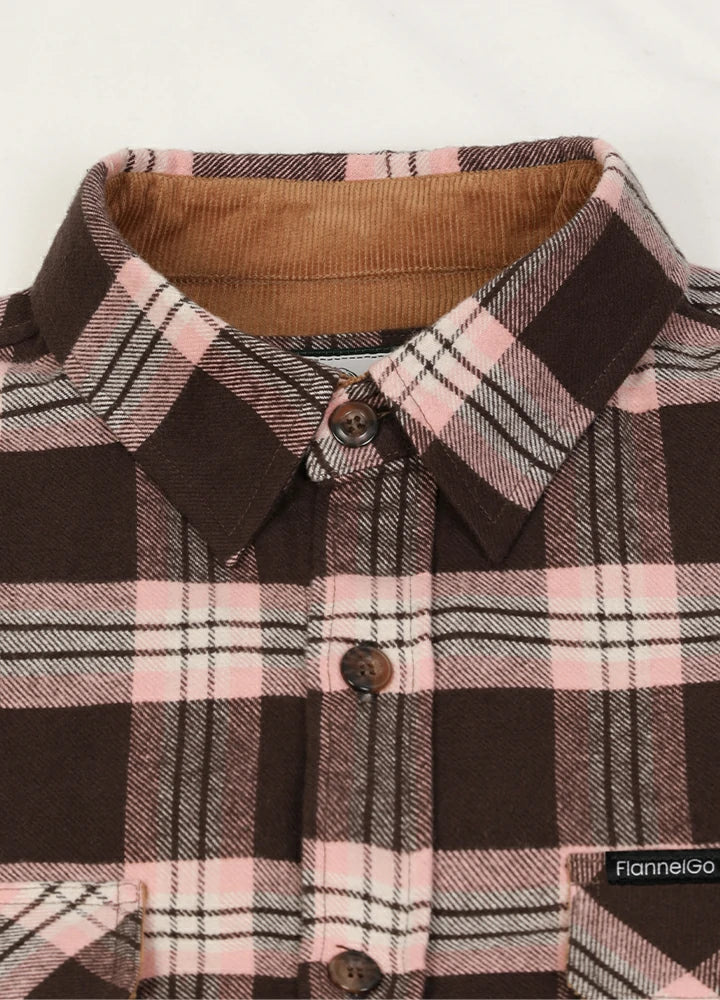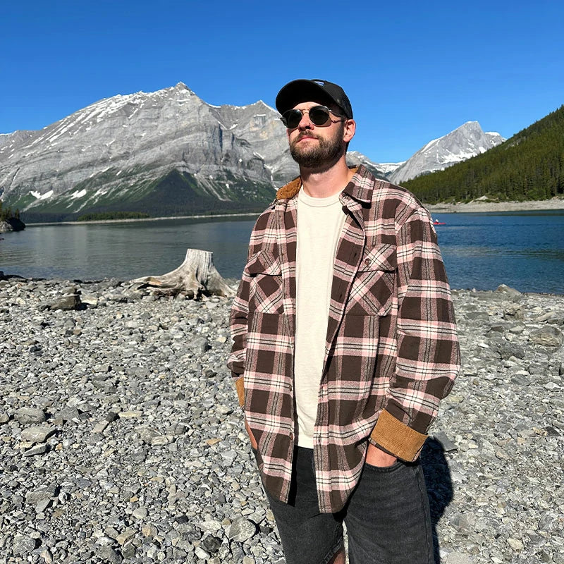 The breath of the mountains and forest hides in this Men's Timberline Midweight Flannel Shirt. Feel the traces of falling autumn leaves and the heaviness of the tough mountains. On the shirt collar and cuffs, we use a corduroy design to add wear resistance and comfort, creating a more unique look that highlights your personality. Button front closure, and chest pockets with a button and flap, you can place your belongings safely. Made of high-quality cotton, thick and durable.
