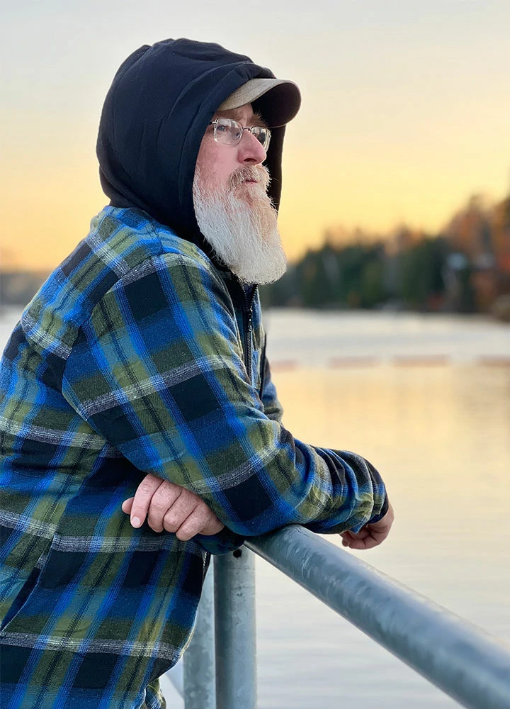 Front view of a man in green blue men's sherpa lined flannel jacket with a hood holding a dog