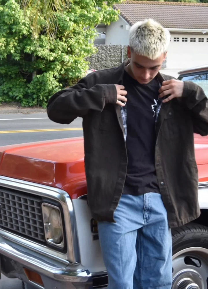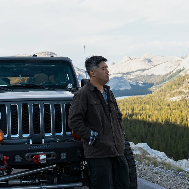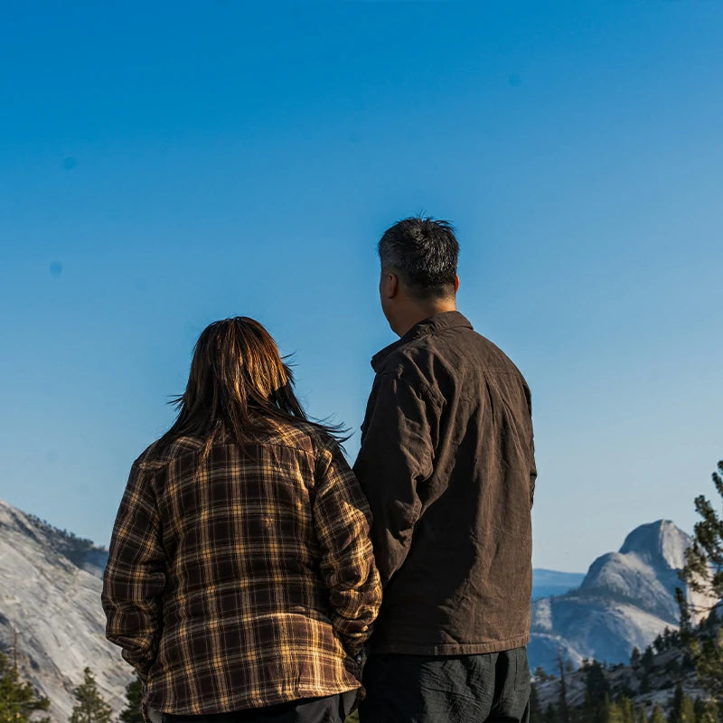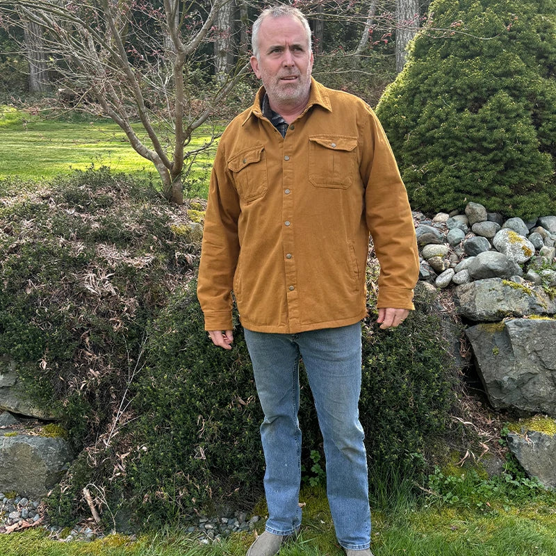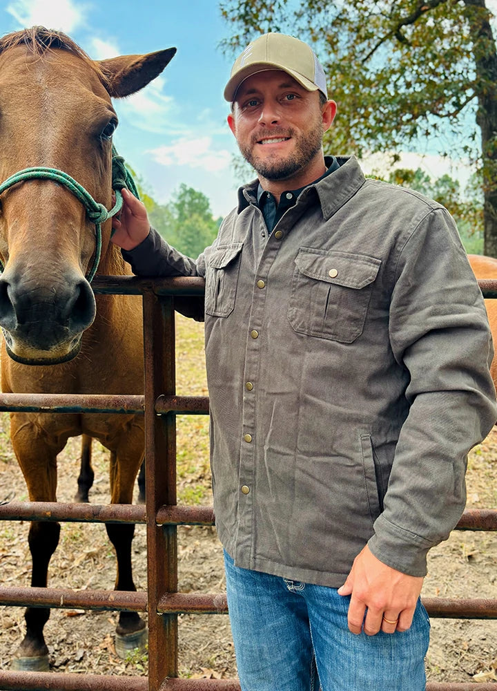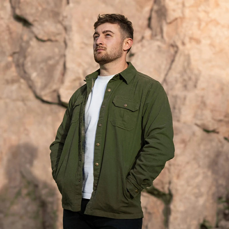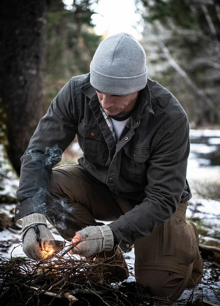 Front view of a man wearing a men's gray flannel-lined heavy utility shirt jacket, starting a campfire in the wilderness to keep warm