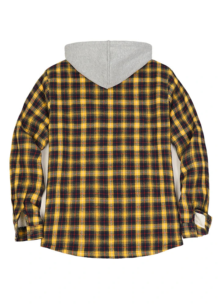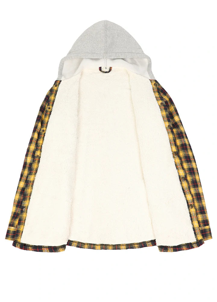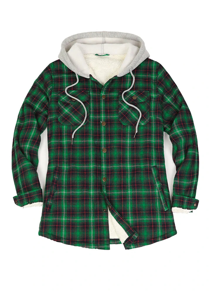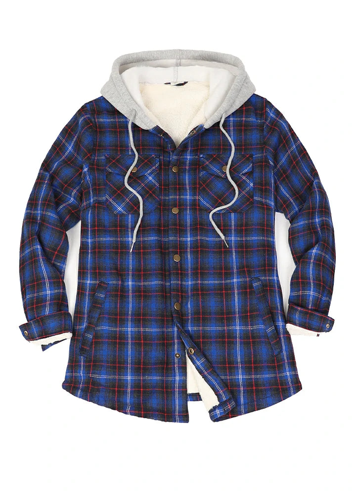 Brave the cold with this Sherpa-lined flannel jacket! Its snap-button front placket and hood keep you snug and warm, while two side pockets and two front flap chest pockets add convenience. Adjustable cuffs with two buttons add extra coverage.