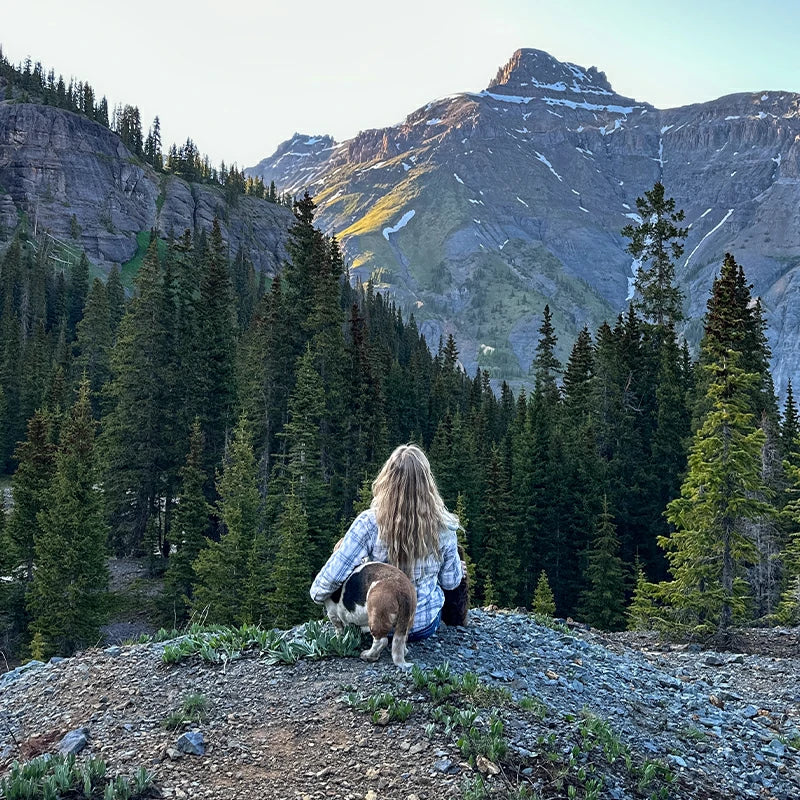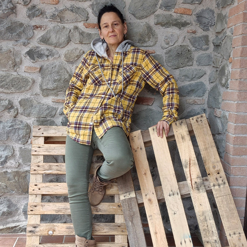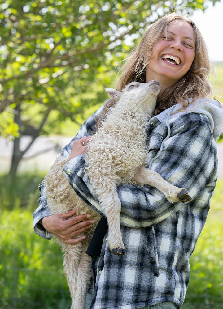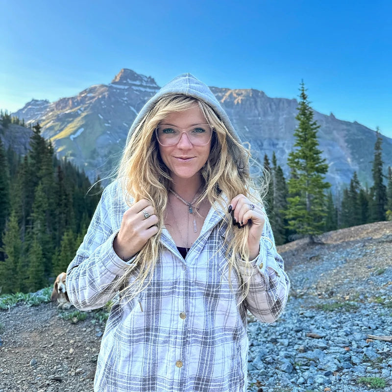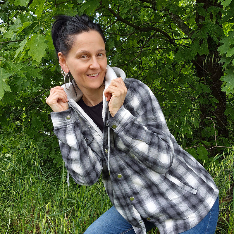 Women in a black white sherpa-lined flannel jacket with fleece hood