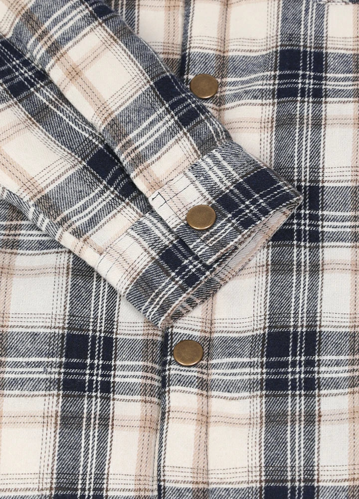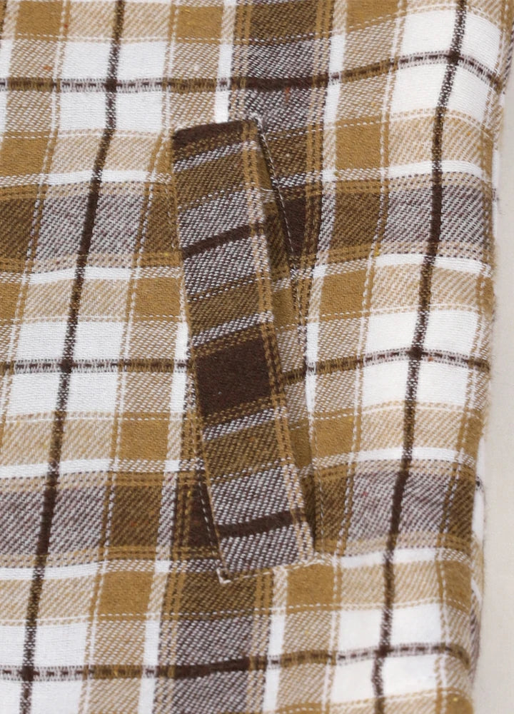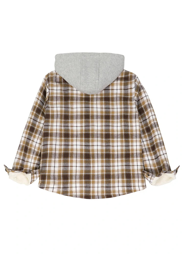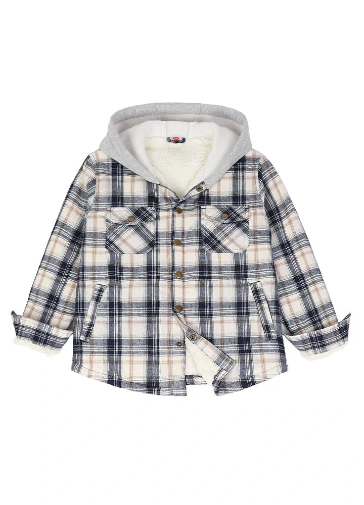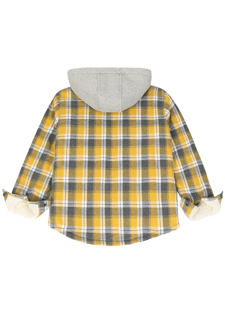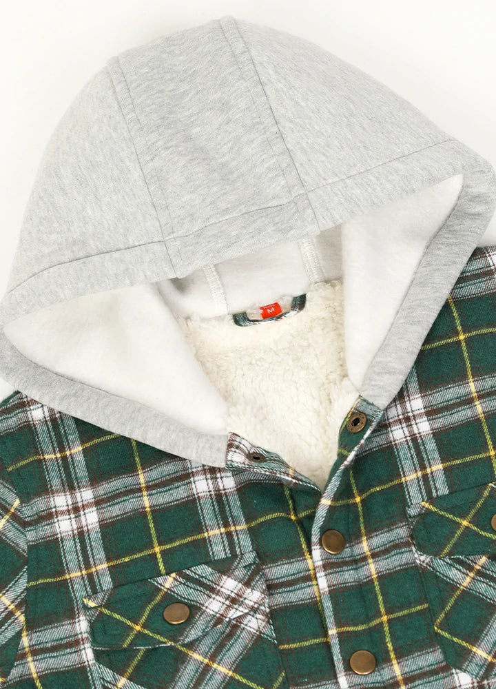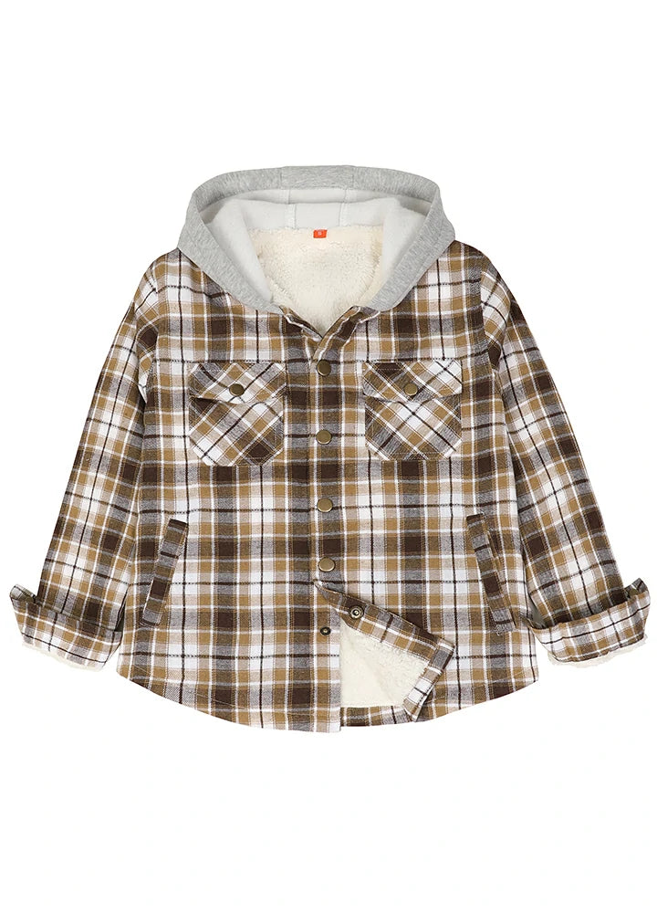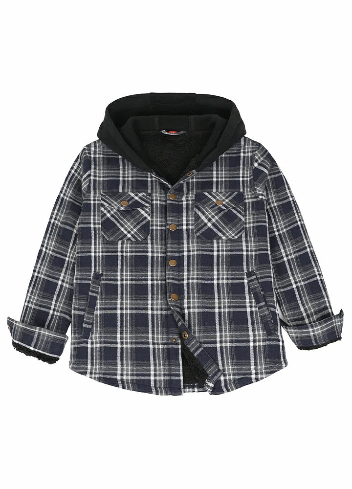 Extend outdoor play with our 6.5oz brush kids plaid flannel jacket. Softens with wash. Features 2 chest pockets, 2 handy pockets. Snap button fleece hood, all-sherpa fleece lined for comfort. Embrace the challenge, be a happy camper!