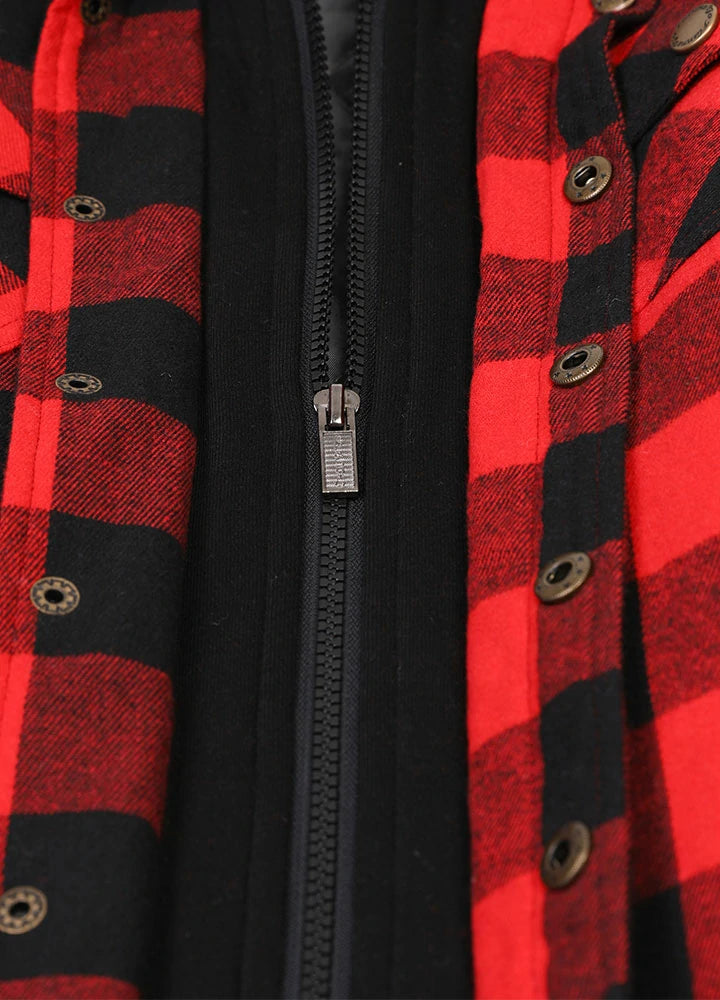 Front view of kid's red buffalo plaid quilted lined flannel jacket buttoned