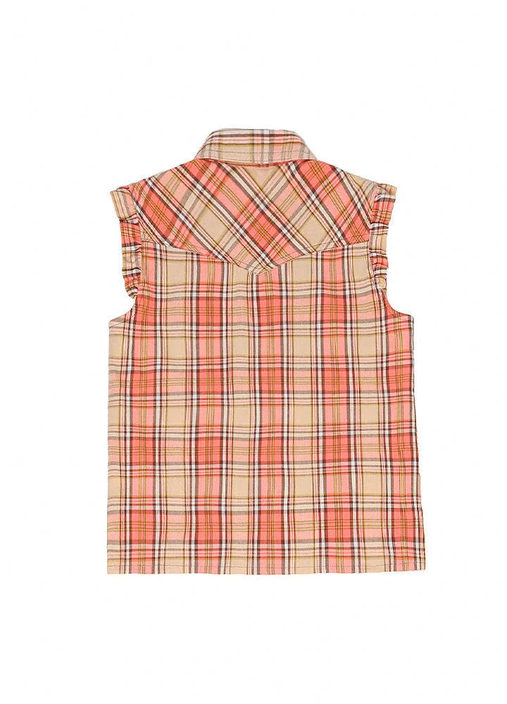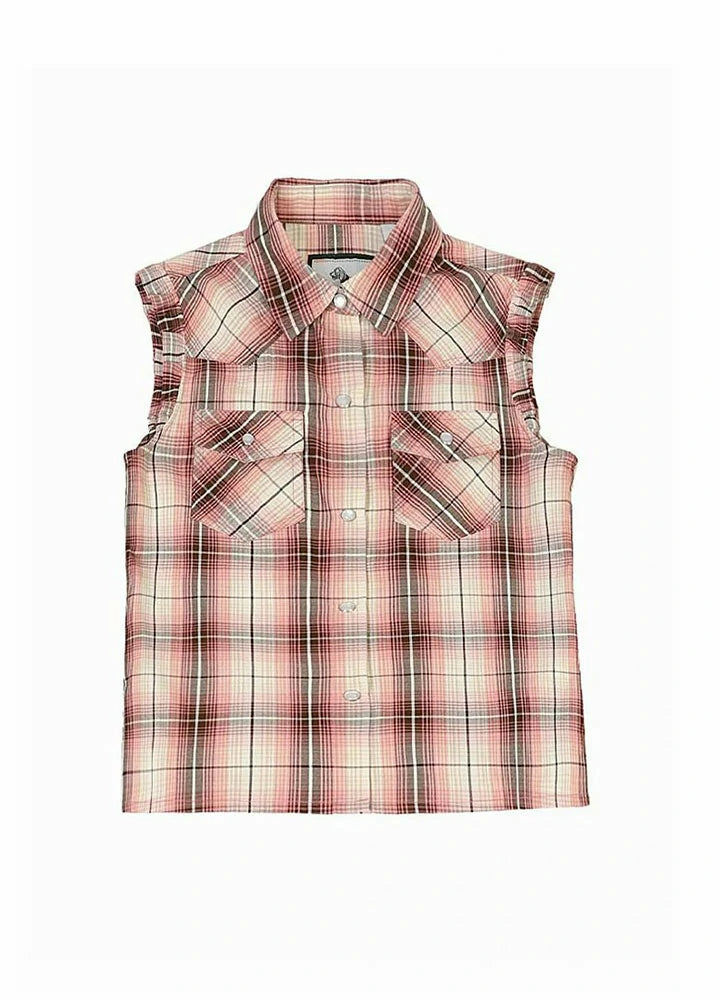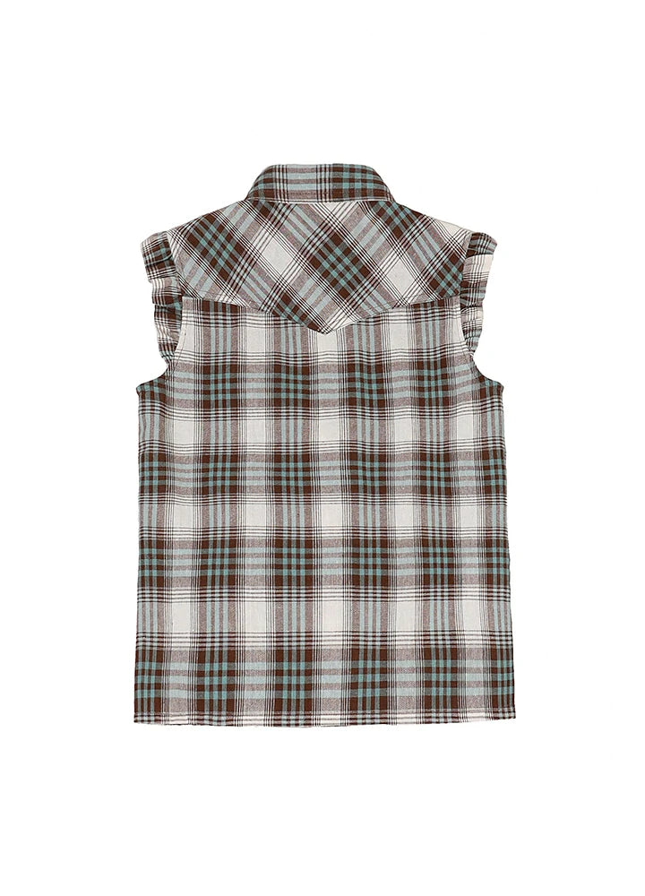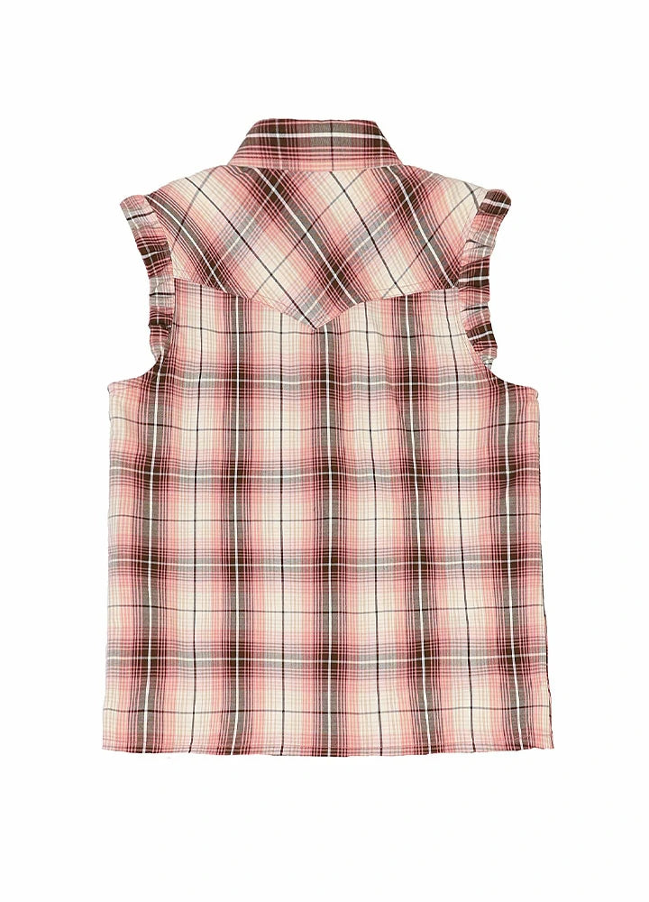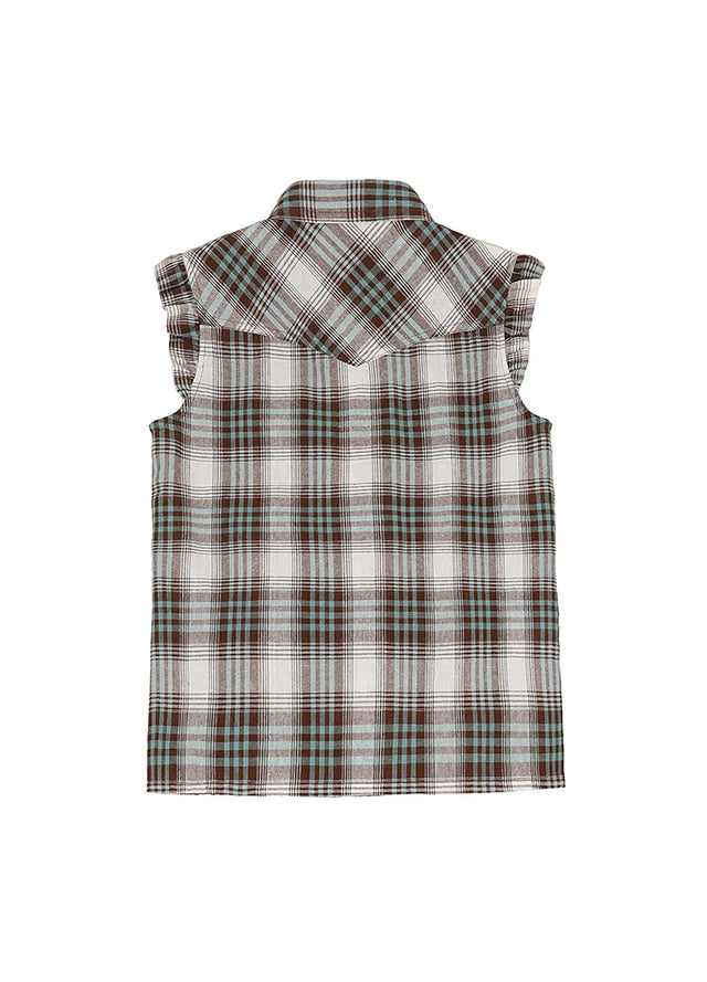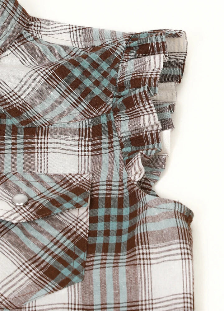 Make a statement with this kids' Western-style plaid tank top made from soft, breathable cotton. Featuring a stylish sleeveless design with snap front closure, this tank top is perfect for everyday wear and has plenty of Western style. The classic Western pearl snap is beautiful and easy to close. The cuffs feature a unique falbala design, and two front pockets provide convenience and style. Pre-washed for easy care.