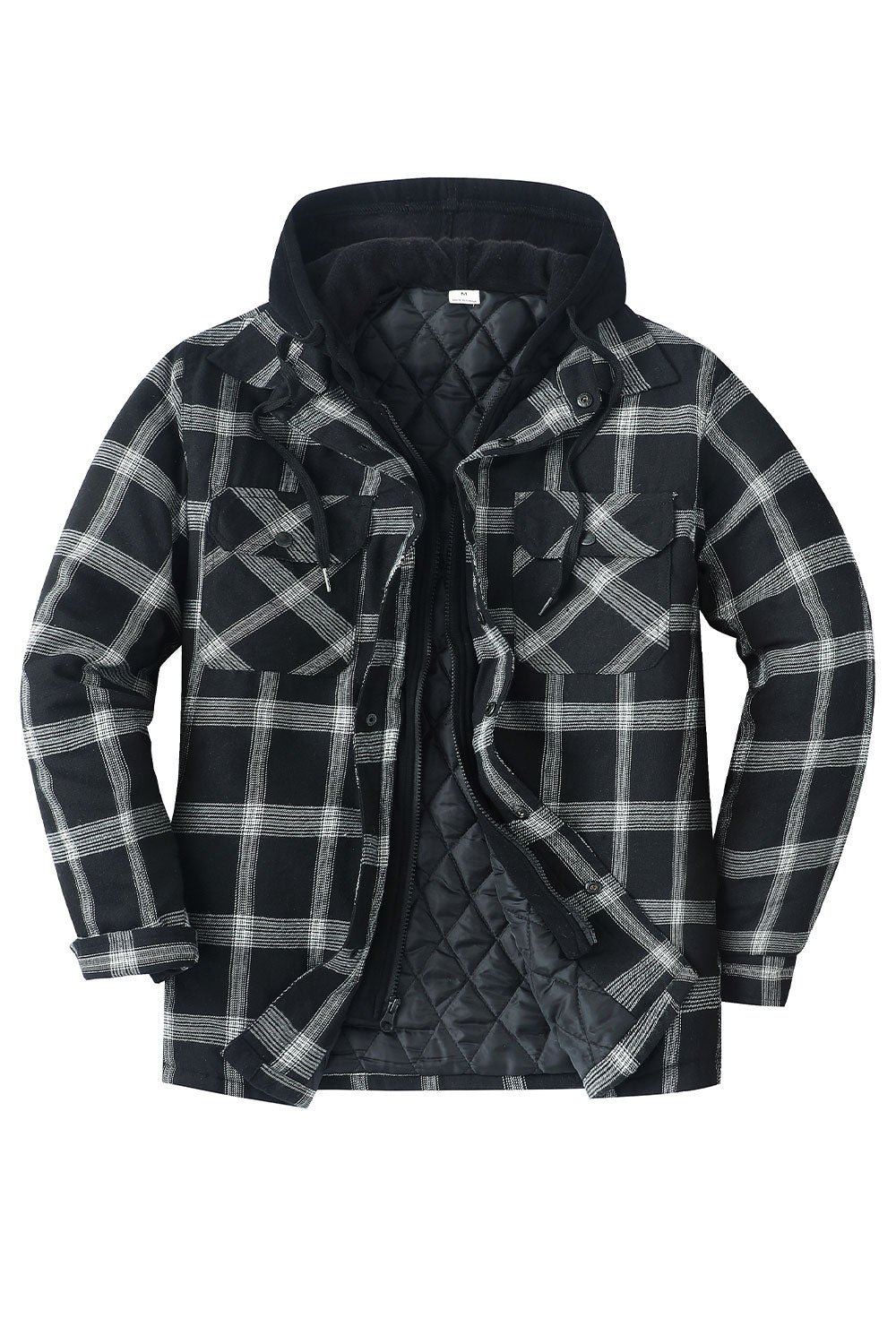 Front view of black white plaid men's thicken plaid hooded flannel shirt jacket