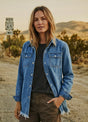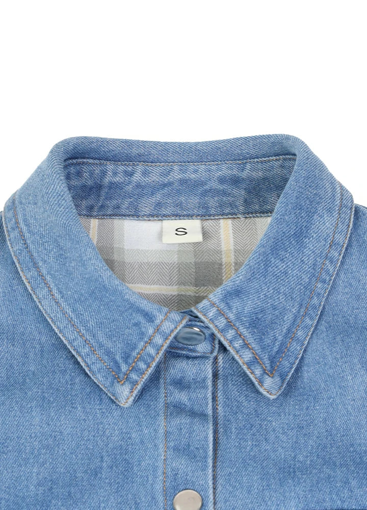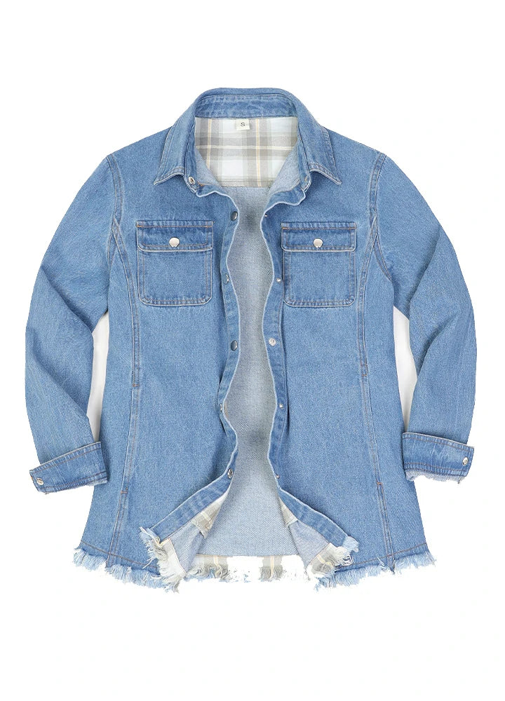 This jacket draws inspiration from the classic Type II jacket of the 1950s, paying homage to the golden age of workwear with its iconic symmetrical square patch pockets. Crafted from 100% premium cotton denim, it's durable and softens with wear. It’s a relaxed fit with a subtly defined waist to maintain a feminine shape. Signature FlannelGo plaid accents at the collar, cuffs, and interior pockets add a distinctive touch of heritage to every detail. It also retains the natural wear and tear of the frayed hem, giving it a more casual feel.