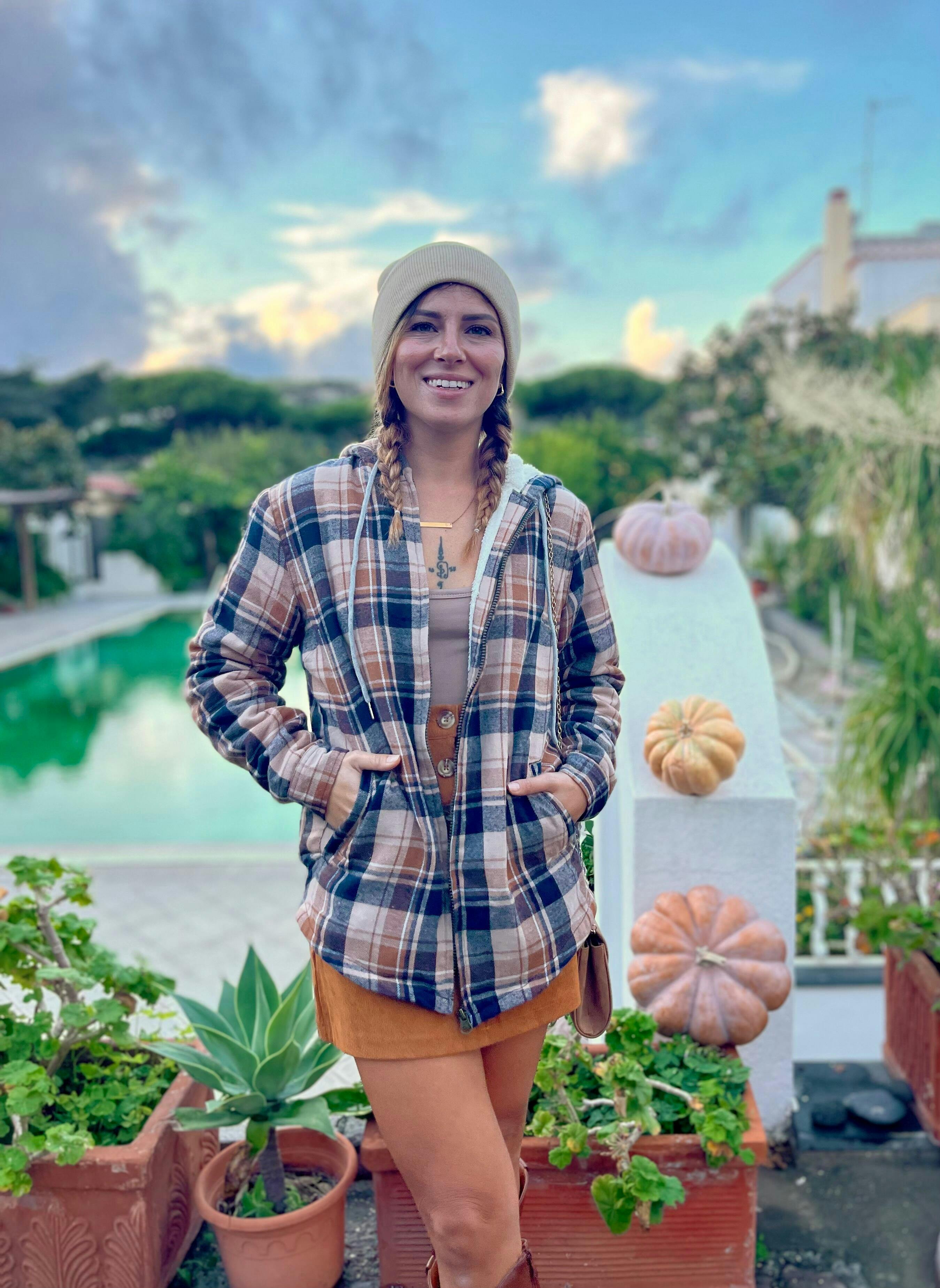 Women in a red black sherpa-lined flannel plaid jacket with hood