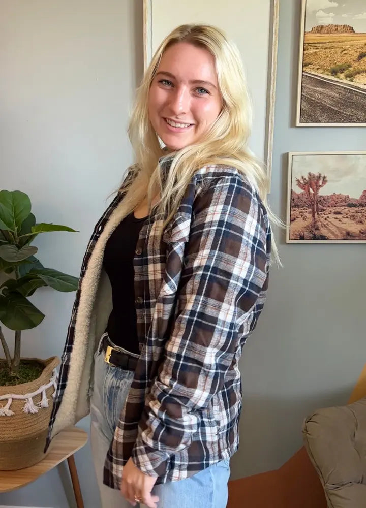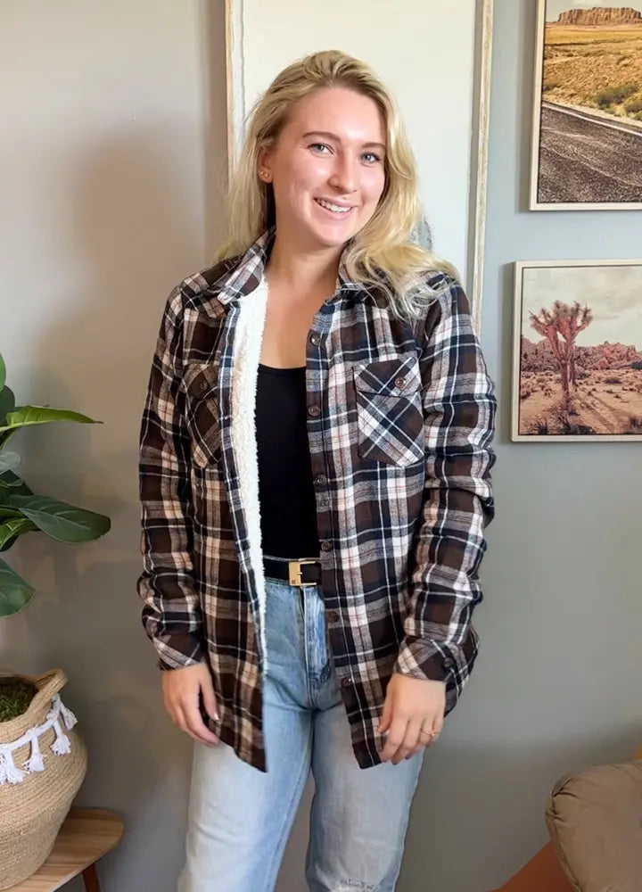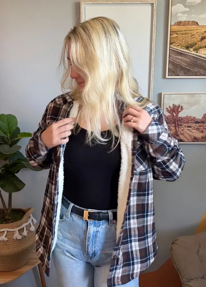 Women wearing a brown white sherpa-lined flannel shirt jacket