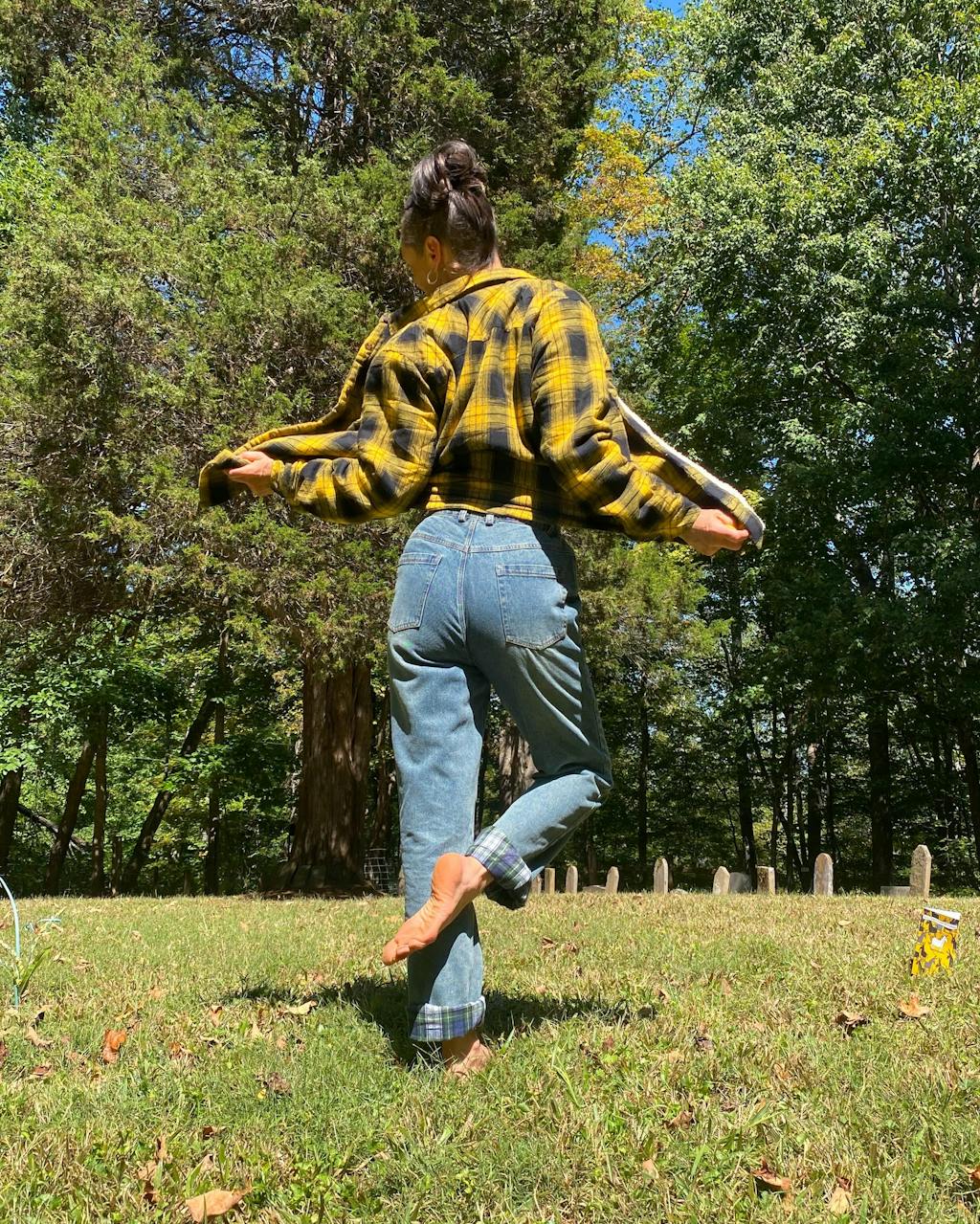 Women wearing a vintage blue flannel lined jeans