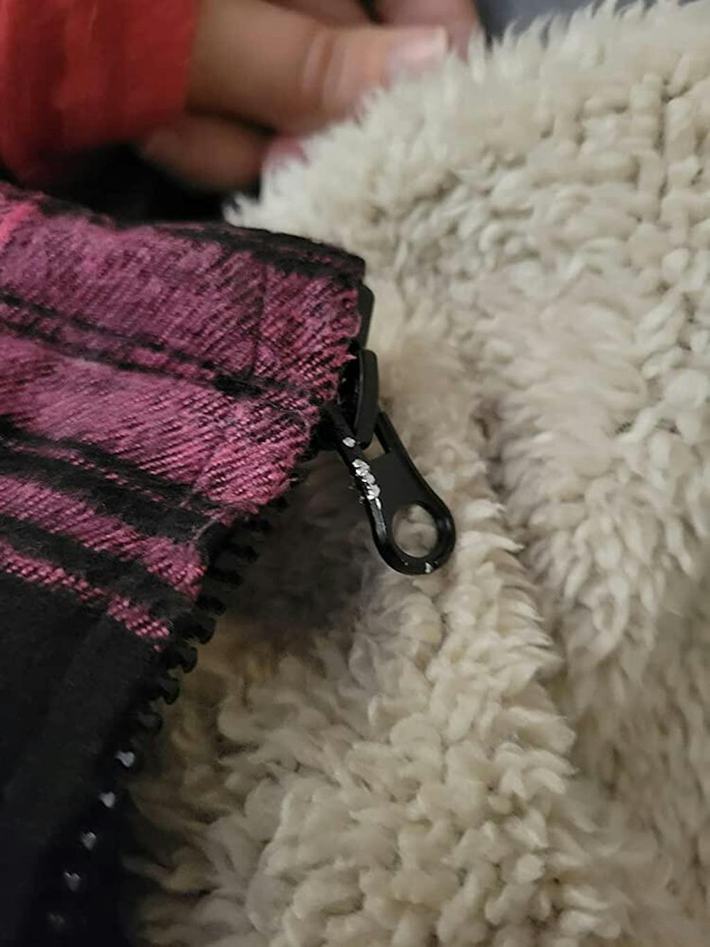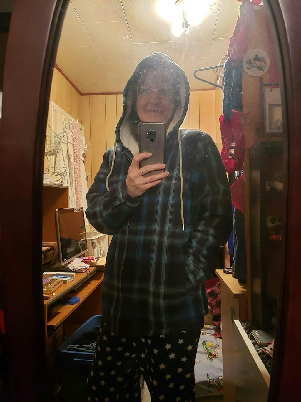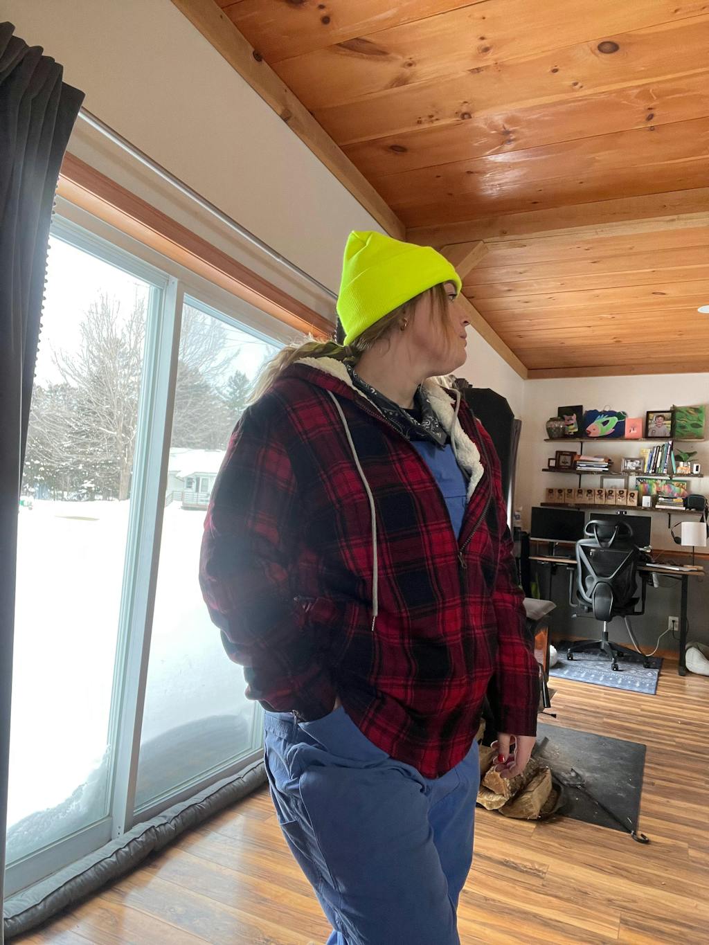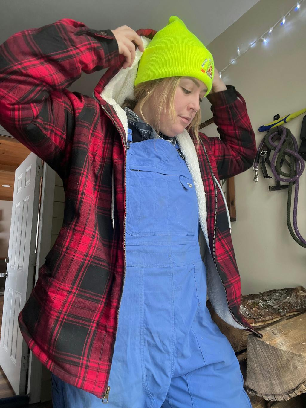 Women in a green black sherpa-lined flannel plaid jacket with hood