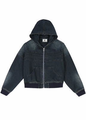This hooded denim jacket draws inspiration from the classic WWII-era deck jacket, blending it with the relaxed silhouette of a streetwear hoodie. Crafted from 100% cotton with a vintage wash, it delivers a deep, richly layered worn-in look. The clean, relaxed fit is to sit just above the hips, enhancing overall proportions. A kangaroo-style hand pocket and soft inner lining provide hoodie-like comfort. Tonal embroidery on the left chest pairs with wind-resistant ribbed cuffs for added detail and function. Machine washable.