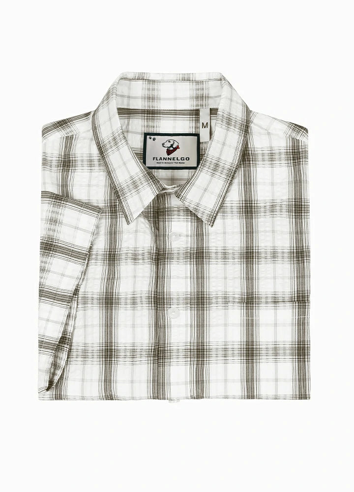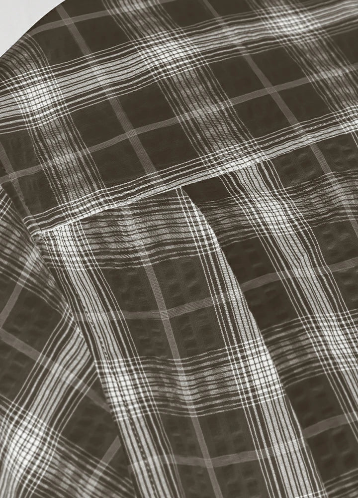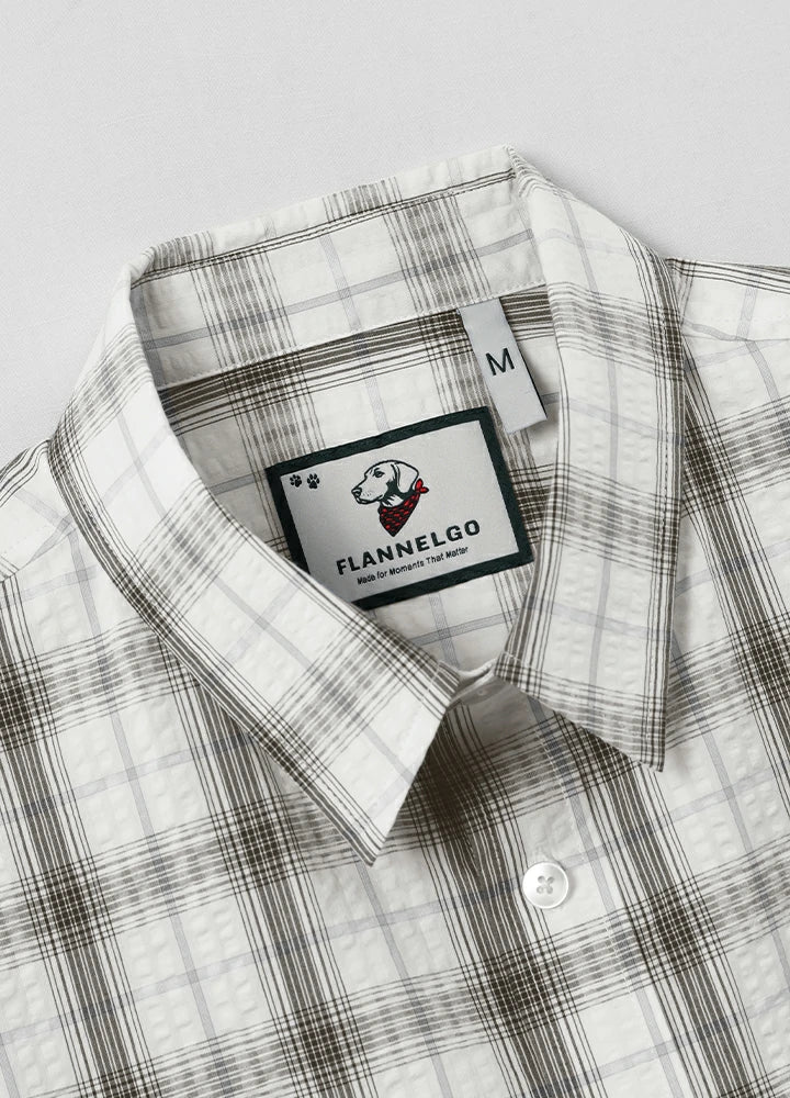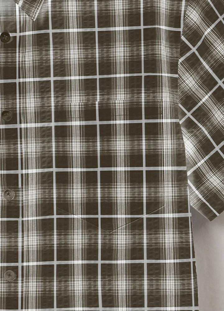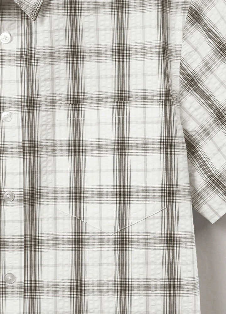 The design philosophy behind this short-sleeve seersucker shirt stems from a pursuit of that quintessential "breathable" sensation of summer. Crafted from ultra-lightweight 3.3 oz, 100% pure cotton fabric, it utilizes a unique 3D seersucker texture to create microscopic air circulation channels between the fabric and the skin, ensuring exceptional moisture-wicking performance and a consistently dry, cool feel. Its Regular fit—combined with a classic workwear-style single chest pocket and a body-flattering shirttail hem—maintains a visually crisp silhouette. Machine washable.