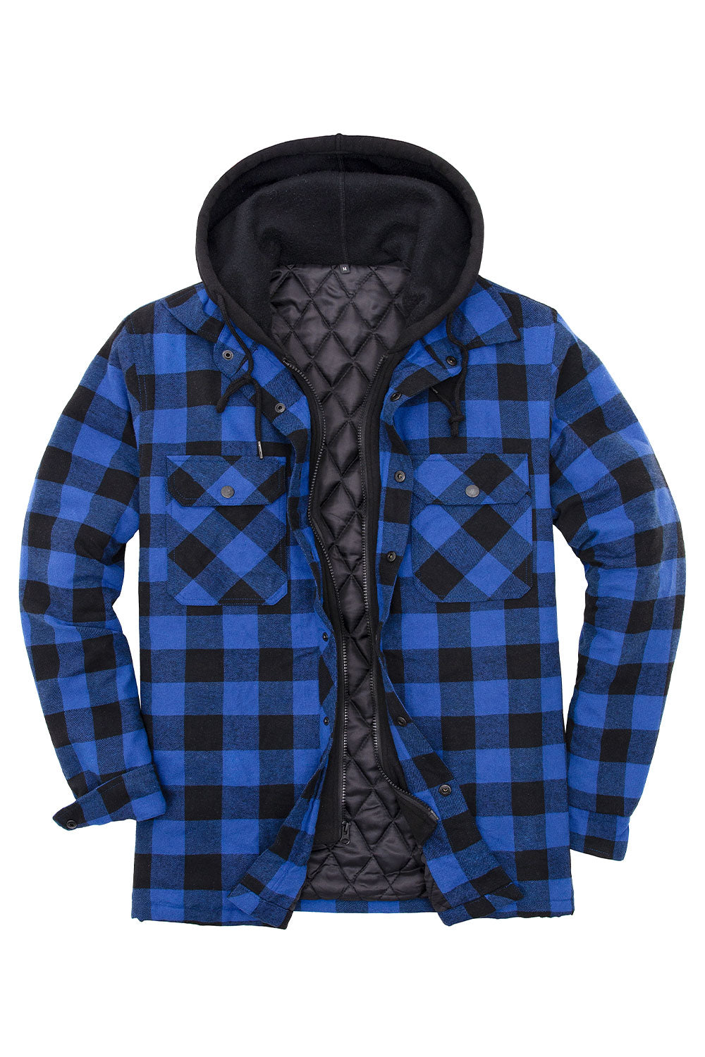 Brave the cold in style with this mens flannel jacket with hood! Snap and zip into adjustable fleece hood and drawstring for a customizable fit. The flannel body and sleeves are quilted for easy on and off, and two chest pockets with secure snap closures plus two inner pockets carry your everyday essentials. Lower seam pockets keep your hands warm. Ready for any occasion, this jacket stands up to the cold while you stay warm and fresh.
