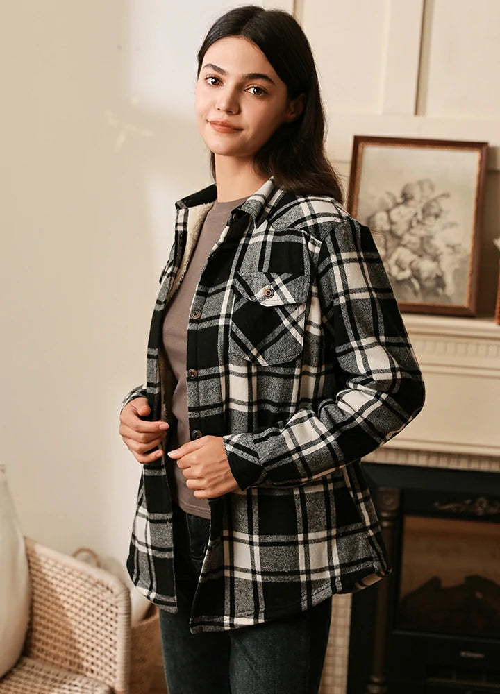 Women in a black white plaid button down flannel shirt jacket with sherpa lining