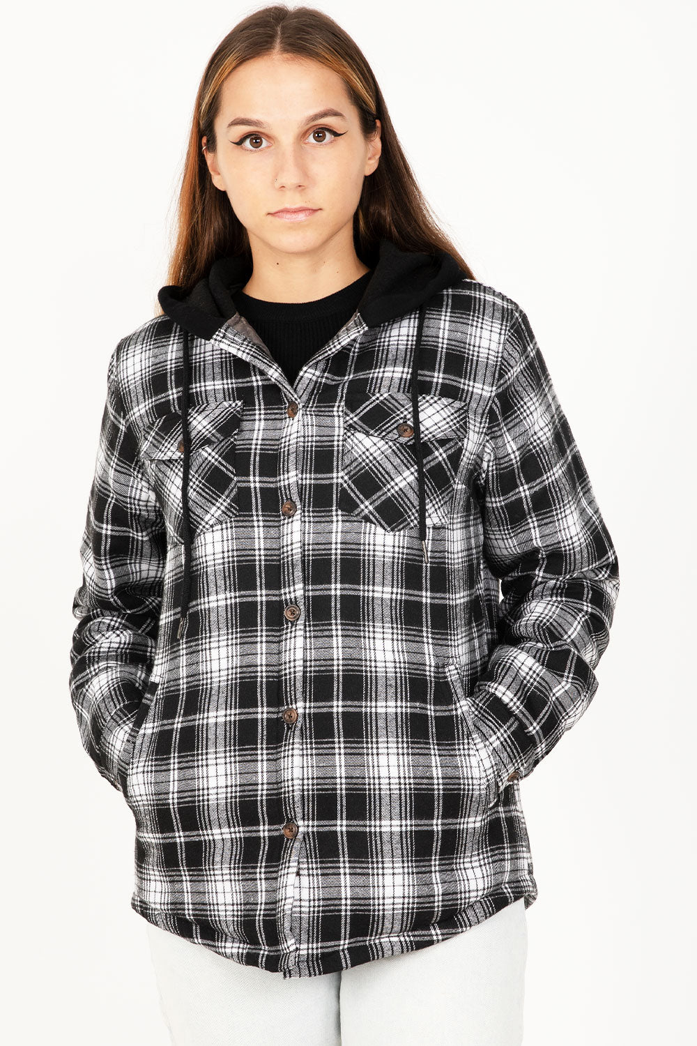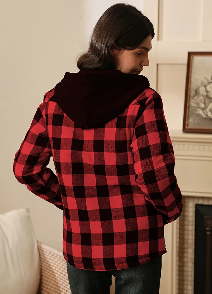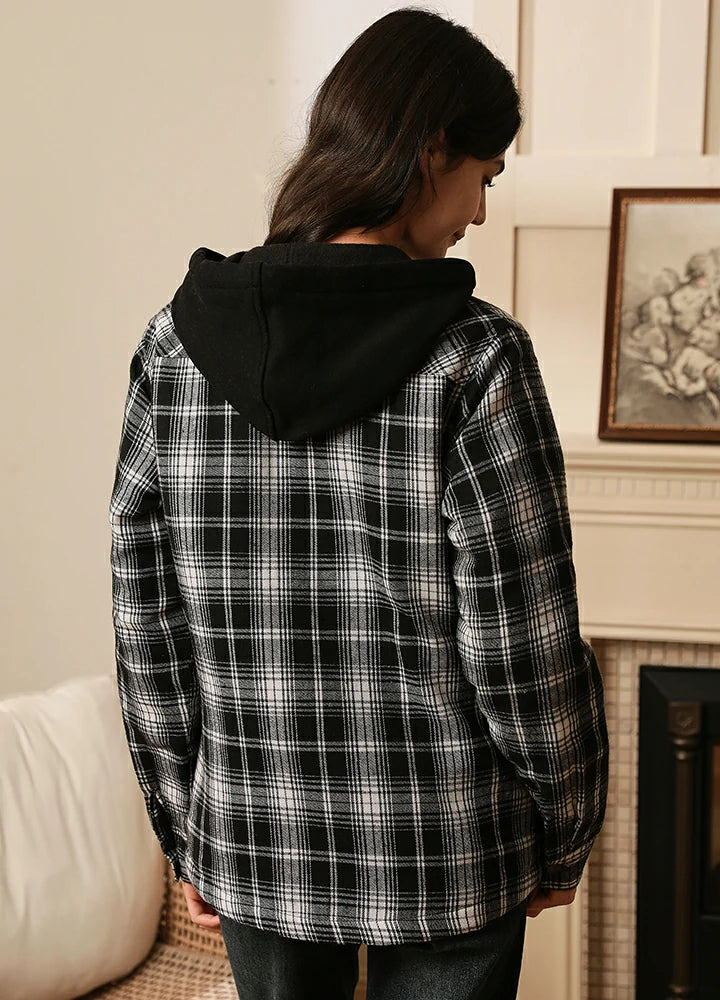 Women's Quilted Lined Hooded Plaid Flannel Shirt Jacket with Hood