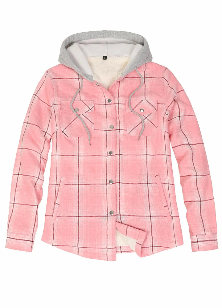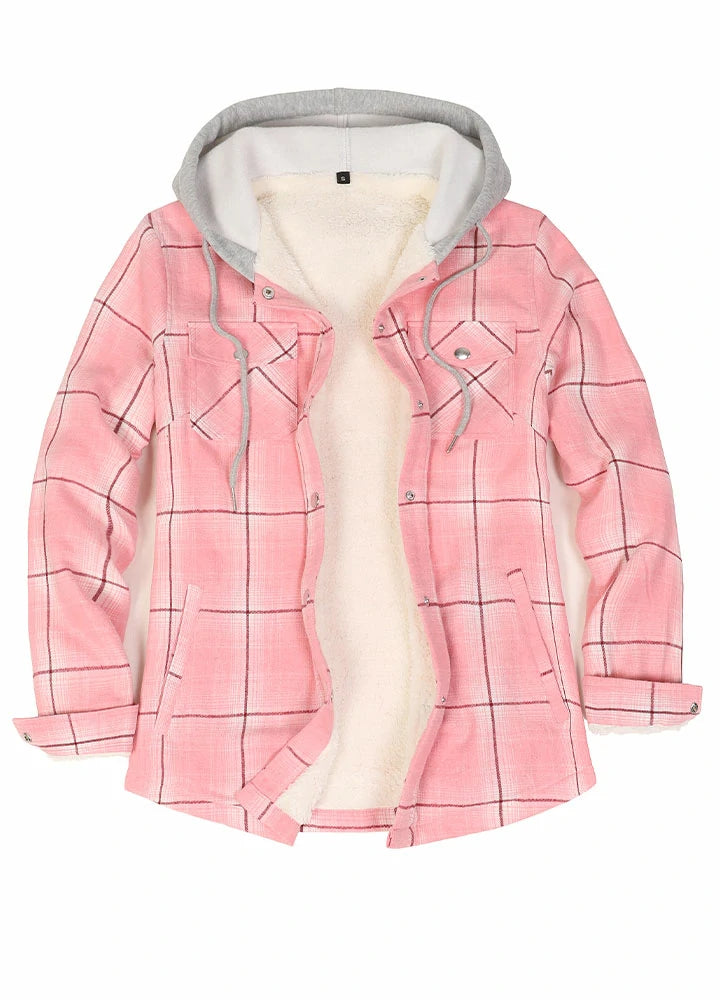 Women's Sherpa-Lined Snap Button Flannel Jacket with Fleece Hood